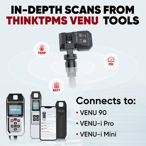 THINKCAR VENU 5 Universal TPMS Sensor With the VENU-5-PRO, enjoy OE-level TPMS sensors with dual frequencies (315 MHz and 433 MHz). Reprogrammable, multi-brand, and with a battery life of up to 6 years. The most advanced solution for TPMS systems.